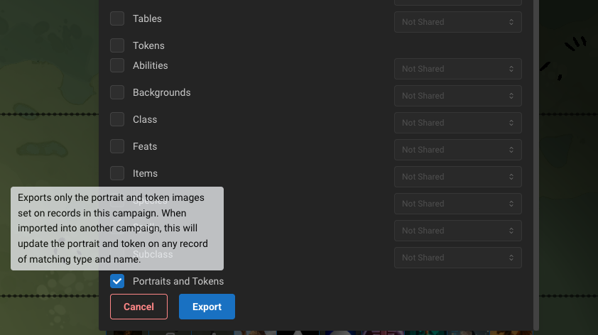 - Scroll down to the bottom and select “Portraits and Tokens” - this will export just the artwork you set on NPCs and Records that you copied or created (which is why we want to copy the NPC first)